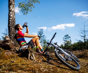 De route eindigt bij de parkeerplaats op de Lemelerberg. Maar niet voordat Erben even stopt om een foto te maken van het uitzicht. ‘Ik heb hier al zo vaak gefietst, maar het blijft mooi.’ Het laatste stuk naar de parkeerplaats word je nog één keer uitgedaagd in een pittige klim die naast de Kerkweg loopt. Ben je na dertien kilometer nog niet moe? Voor mountainbikers die ook andere gebieden willen ontdekken heeft Erben een tip. ‘Je kunt hier eindeloos mountainbiken door meerdere mountainbikeroutes met elkaar combineren.’ De route van de Lemelerberg kun je bijvoorbeeld combineren met de dertig kilometer lange mountainbike route vanuit Holten en de achttien kilometer lange mountainbikeroute Hellendoorn. En als dat je toch net iets te veel is, dan fiets je de favoriete route van Erben toch gewoon nog een keer? ‘Dit parcours is zo afwisselend, het verveelt hier nooit!'