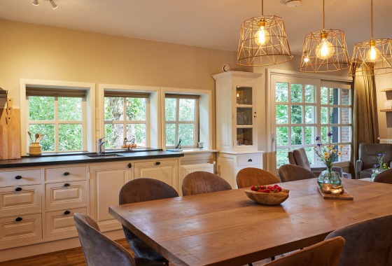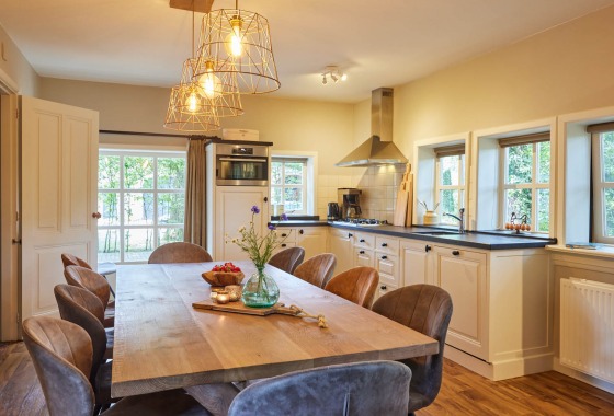 Een gezellige keuken met een grote houten tafel waar iedereen kan zitten. Een hoekbank, tv en wifi. Tuindeuren naar het terras, een overdekt terras, en nog meer gezellige zitjes om het huis en op het erf. Het hele vakantiehuis is goed geïsoleerd en voorzien van centrale verwarming.