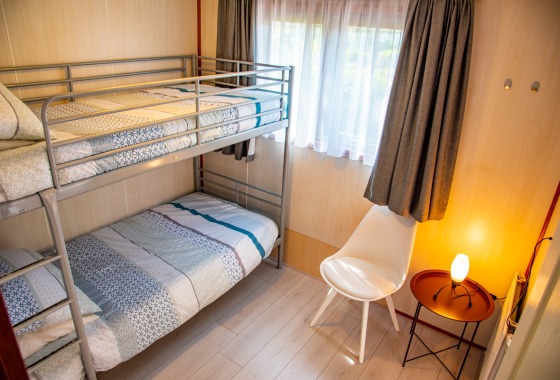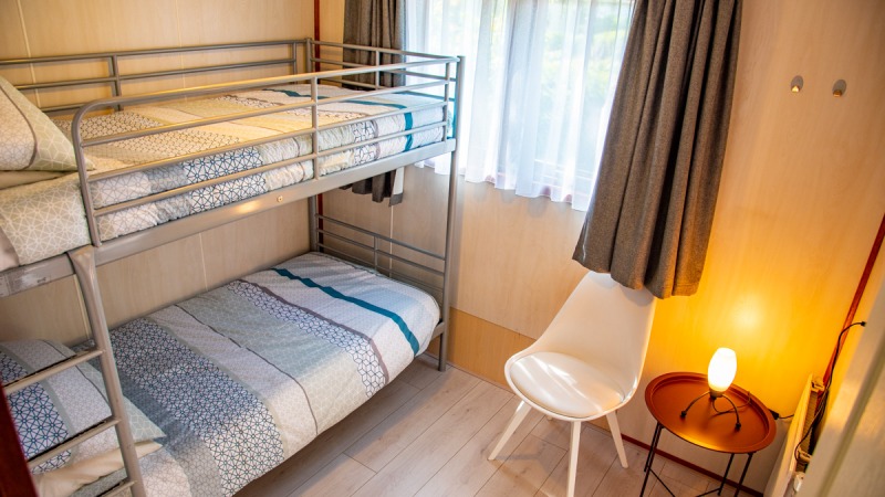 Het vier-persoons chalet is eenvoudig maar compleet ingericht. Het heeft twee slaapkamers. Slaapkamer een heeft een twee-persoonsbed en slaapkamer twee heeft een stapelbed. Ook is er een ruime badkamer aanwezig. Het chalet heeft meerdere terrassen en een gedeeltelijke omheinde tuin. Beschikt over een eigen parkeerplaats en tevens is er een schuurtje aanwezig waar je de fietsen neer kunt zetten en eventueel kunt opladen.