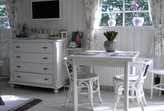 Het Tuinhuisje heeft een ruime woon/slaapkamer met een 2-persoonsbed, eethoek en TV, keukentje en een luxe badkamer met toilet, wastafel en douche.