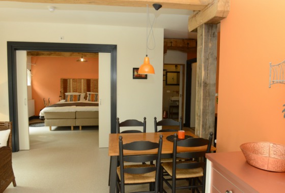Één boerderijkamer (oranje) op de begane grond is rolstoel toegankelijk en heeft een eigen koelkast, zithoek, T.V., WI-FI, haardroger en een inrijdouche met toilet.