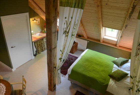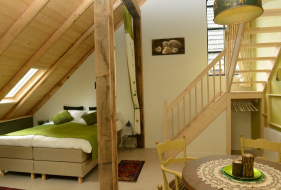Op de eerste etage bevinden zich vier (goud, groen, roze en blauw) ruime boerderijkamers tussen de gebinten. De roze en blauwe kamer zijn geschikt voor 2 personen. De gouden en groene kamer zijn geschikt voor 2-4 personen, waarvan 3 boxspring en eventueel een volwaardig bijzet bed (3de en 4de persoon slapen onder de hanenbalken).