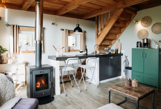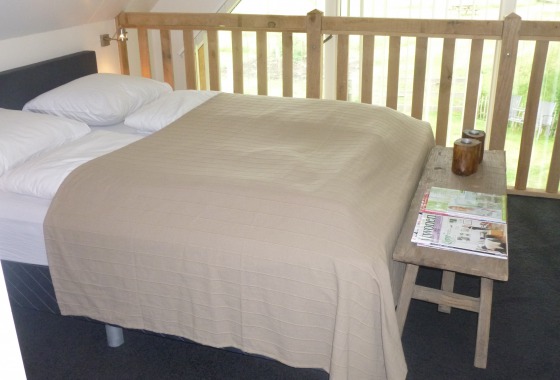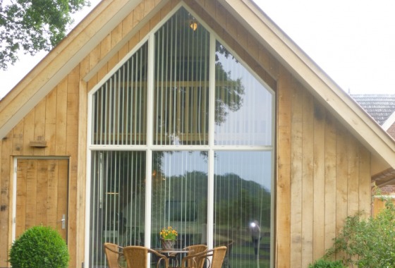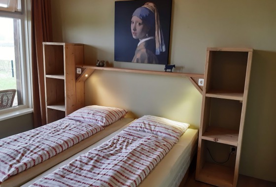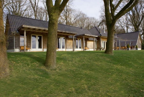 Het huis is opgetrokken uit eiken delen wat ook binnen, samen met de houtkachel, zorgt voor extra sfeer. De glazengevel tot in de nok levert een prachtig uitzicht over de weilanden. De lodge beschikt over een kitchenette, sanitair, zithoek en 2 slaapkamers met 1-persoons bedden. Meer over de Lodge.