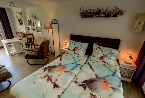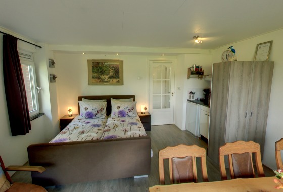 Deze B&B heeft drie kamers voor zes personen, twee met eigen badkamer en kitchenette op de begane grond. Het ontbijt kan optioneel extra bijgeboekt worden.